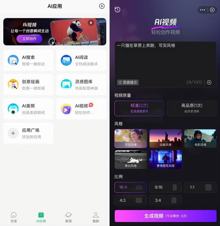 通过腾讯元宝APP-AI应用-AI视频即可使用该功能(前期需申请)