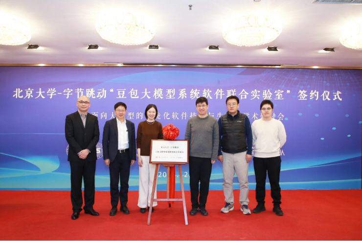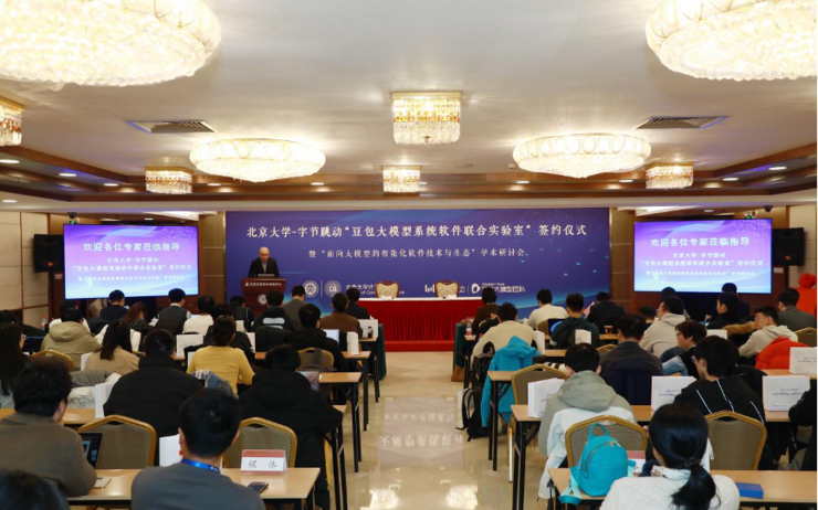 12月12日,北京大学-字节跳动“豆包大模型系统软件联合实验室”签约仪式暨“面向大模型的智能化软件技术与生态”学术研讨会在北京大学英杰交流中心隆重举行。北京大学计算机学院院长胡振江、党委副书记魏朋、北京大学科技开发部副部长郑如青、字节跳动科研战略与学术合作负责人金小伟、字节跳动豆包大模型Foundation团队负责人项亮等出席活动。活动由联合实验室主任、北京大学计算机学院刘譞哲教授主持。