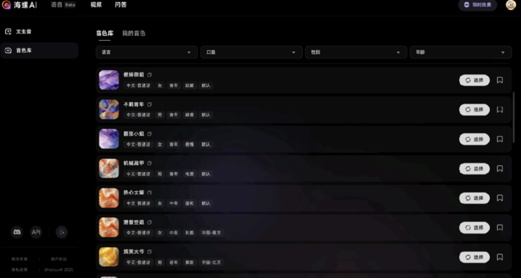 从妇人发现怪老头冲自己喊叫时的紧张、惊慌、害怕,到发现是自己年轻时的堂哥走散落魄至此,此时声音变低落展现难过,再到重逢时的开心有明显的音调上扬,海螺 AI 对输入的文字有精准理解,对输出的声音也可以做到层次分明,精细地控制。除了情绪的精准控制外,海螺语音的另一个明显优势时预置不同语种共计300+音色供用户选择,用户可按语言、口音、性别和年龄分类筛选。音色多变,不羁、诙谐、慈祥等风格丰富多样,有声书、ASMR耳语、新闻播报等场景均可适用。
