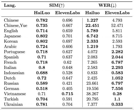 根据用户真实场景,MiniMax 建立了多语种评测集,并对17个语种进行客观评测。其中,每种语言选取2-10个音色,生成50条以上音频进行评估。结果显示,海螺语音相似度整体占优,综合能力媲美 ElevenLabs。在中文、粤语、英语、日语、韩语和阿拉伯语等多个语种上,海螺语音的相似度、正确率方面大幅领先。