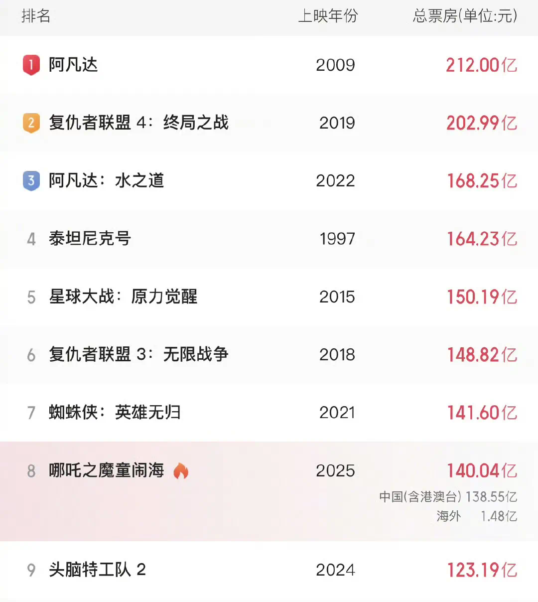 就在昨天,《哪吒之魔童闹海》票房已破 140 亿,不仅荣登全国票房第一,挤进全球票房前八,同时也荣登全球动画票房第一。