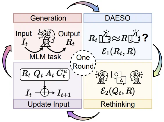 整理当前轮交互的所有信息,和系统提供的提示,称为下一轮的 history prompt,重新进入第 1 步生成创新响应环节。