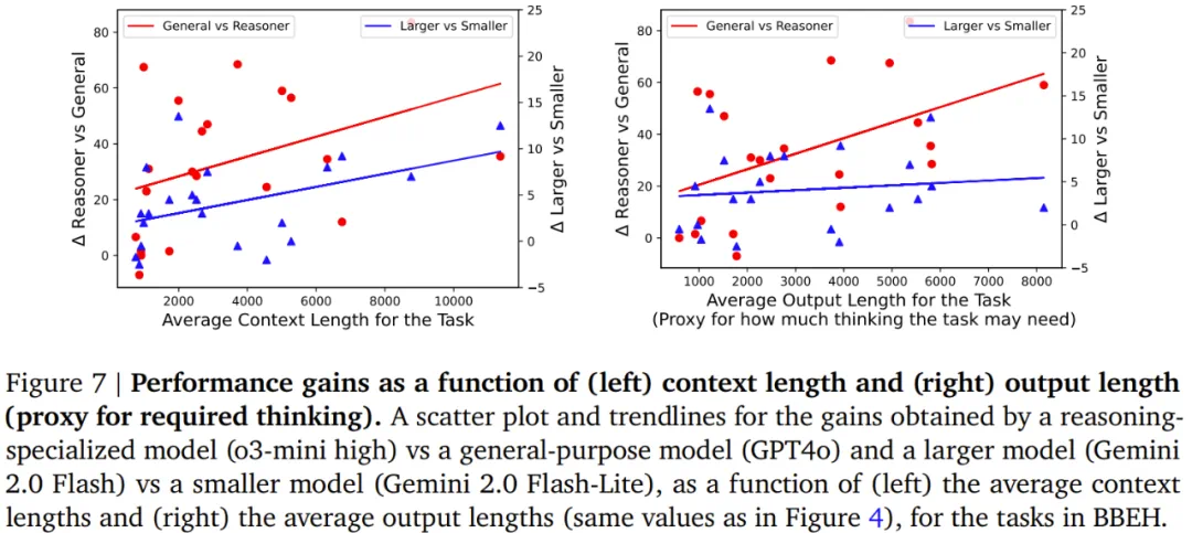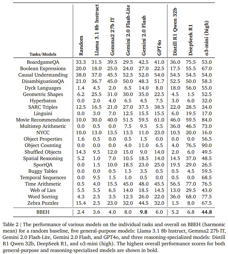 通用模型的最佳性能为 9.8% 的调和平均准确率。推理专用模型在该基准上的表现优于通用模型(符合预期),但这些模型在 BBEH 上的最佳性能仍只有 44.8%。 -