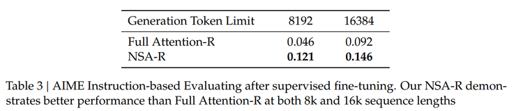 最后用 AIME 24 基准来评估所生成的两个模型Full Attention-R(全注意力基准模型)和 NSA-R(稀疏变体模型)的表现。