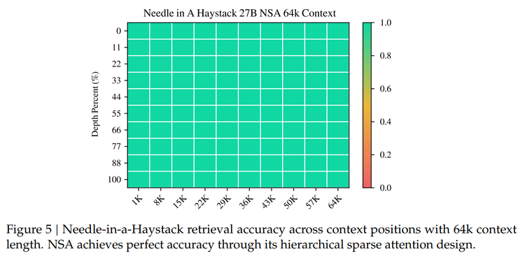 另外,在长上下文任务中, NSA 在 64k 上下文的“大海捞针”测试中表现出了极高的检索精度。这归功于其分层稀疏注意力设计,通过粗粒度的token压缩实现了高效的全局上下文扫描,同时通过细粒度的选择性标记来保留关键的信息,从而有效平衡了全局感知与局部精确度。
