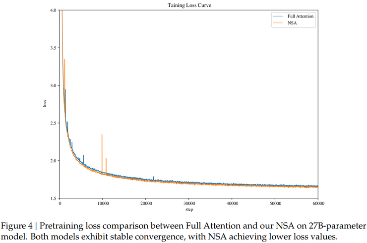 测试中 NSA 的预训练损失曲线相比全注意力基线呈现出更加稳定和平滑的下降趋势,且始终优于全注意力模型。