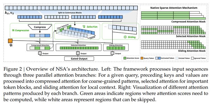 为实现更高效的稀疏注意力,DeepSeek 研究团队提出了一种原生可训练的稀疏注意力架构 NSA,这个架构的核心内容是通过动态分层稀疏策略,结合粗粒度的 token 压缩和细粒度的 token 选择,从而保留全局上下文感知能力和局部精确性。