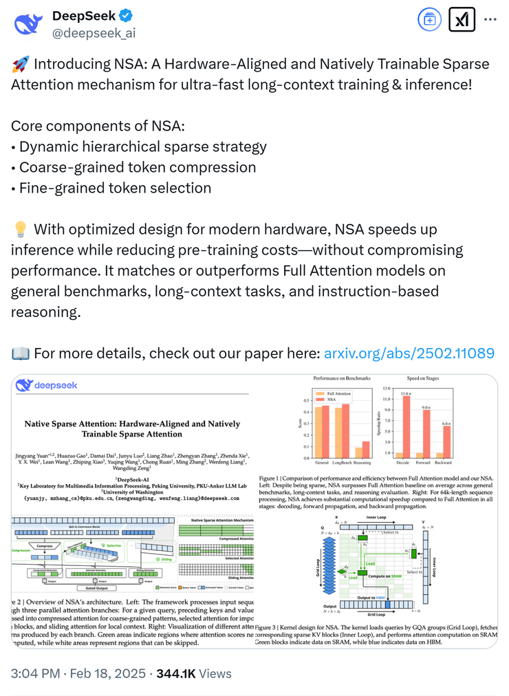 而这次 DeepSeek 团队最新的研究论文更是重磅,论文中介绍了一种全新的,可用于超快速的长上下文训练与推理的注意力机制 —— NSA,值得一提的是,NSA 还具有与硬件对齐的特点,十足的硬件友好。