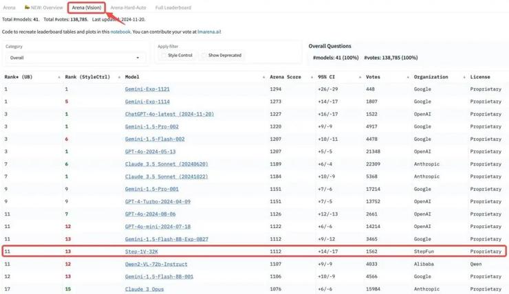 例如在 2024 年 11 月 22 日 LMSYSOrg 发布的大模型竞技场 ChatbotArena 最新榜单中,阶跃 Step-1V 上榜,位列视觉领域中国大模型第一,总分跟 Gemini1.5-Flash-8B-Exp-0827 持平,超过国内所有大模型公司。