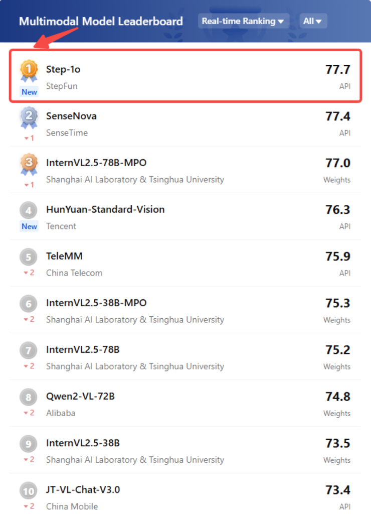 两个月后,阶跃 Step-1o 系列模型又在国内权威的大型模型评估平台“司南”(OpenCompass)多模态模型评测实时榜单中拿下了第一名。