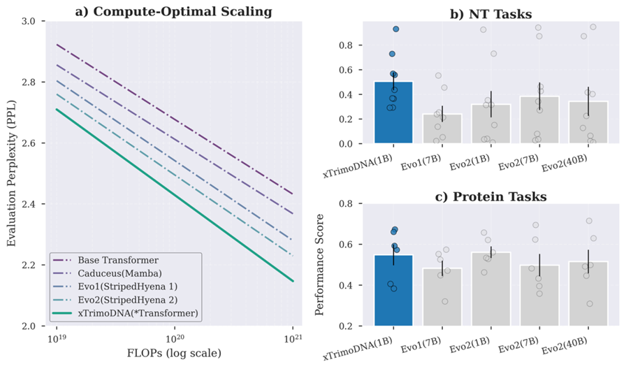 值得一提的是,单就蛋白模态而言,其单模型参数已达100B,并在Evo2论文中被引用为「xTrimo large」,充分彰显了其在模型规模上的领先优势。