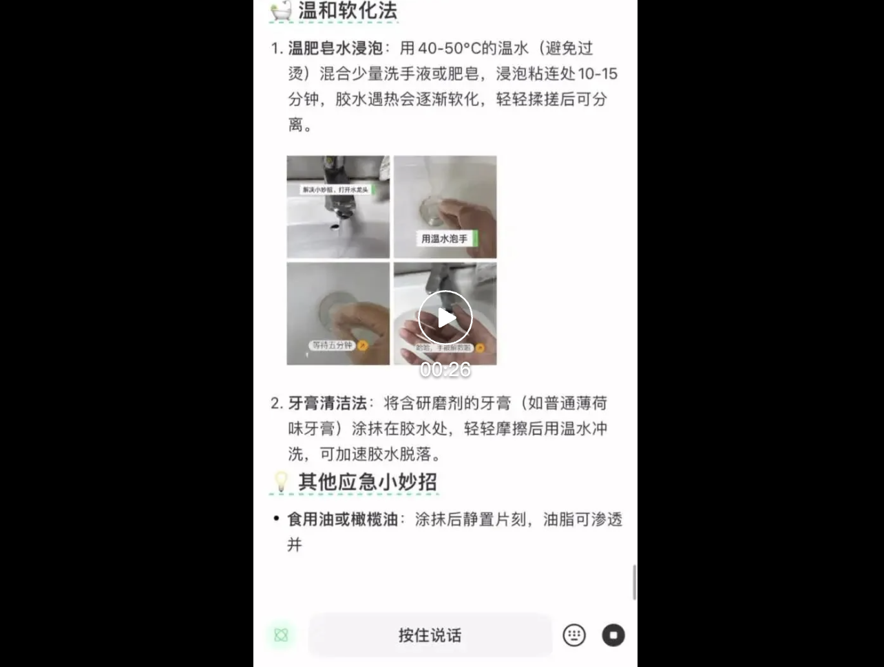 我们直接语音提问,502粘住了手怎么办?点点立马拿出6种解决方案,其中的卸妆油溶解法亲测过,有效。