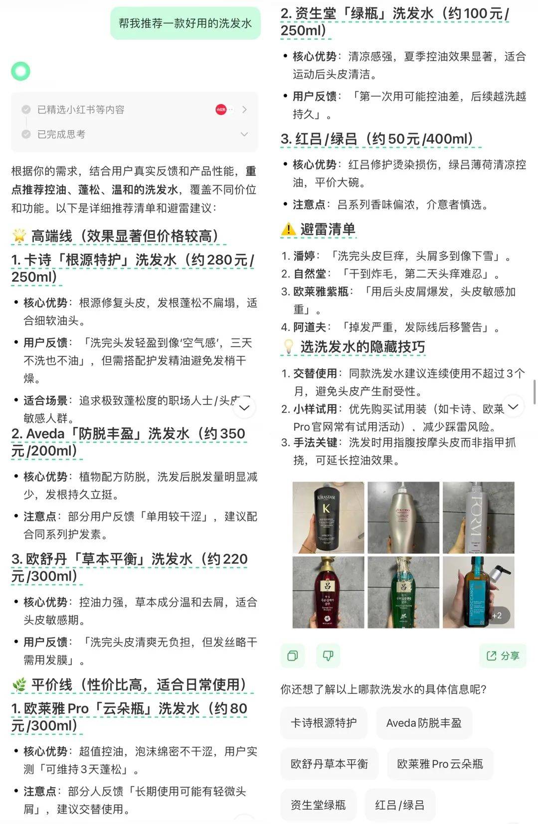于是,我们分别让它俩推荐一款好用的洗发水,点点搜索了 20 篇小红书帖子,综合了成百上千的网友评论,按照高端、平价不同价位推荐了 6 款洗发水。