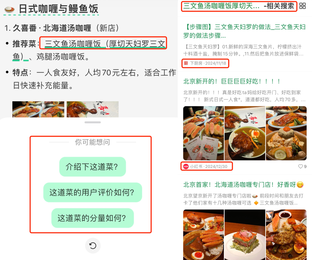比如点击「三文鱼汤咖喱饭」,你可以继续追问:介绍下这道菜,或者用户评价、分量如何等。