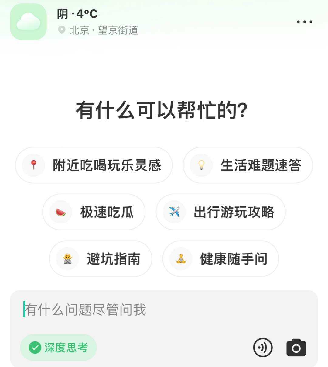 左上角是定位的地址和天气,中间一栏是预设的问答场景,包括「附近吃喝玩乐灵感」、「生活难题速答」、「极速吃瓜」、「出行游玩攻略」、「避坑指南」、「健康随手问」。