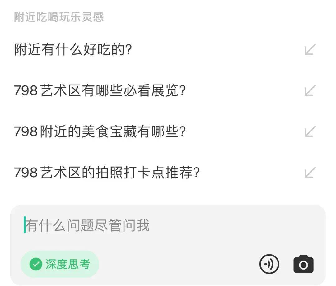 只要定了位,点击「附近吃喝玩乐灵感」,它就会自动弹出问题。