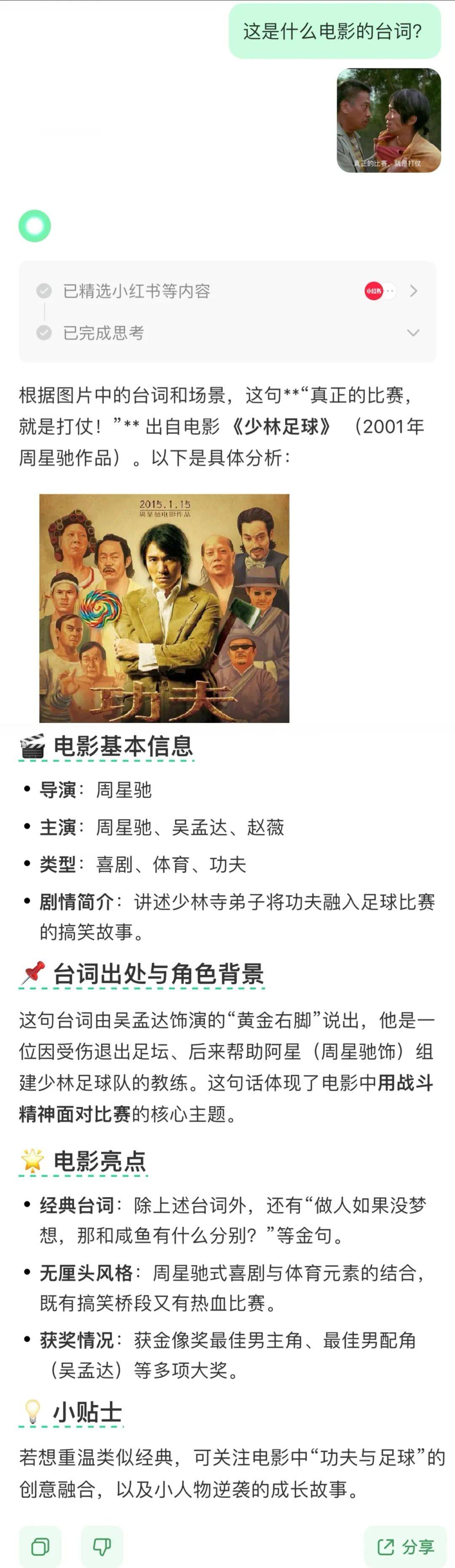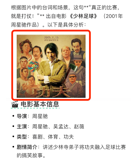点击右下角相机的图标,上传一张周星驰电影的台词截图,输入提示词:这是什么电影的台词?