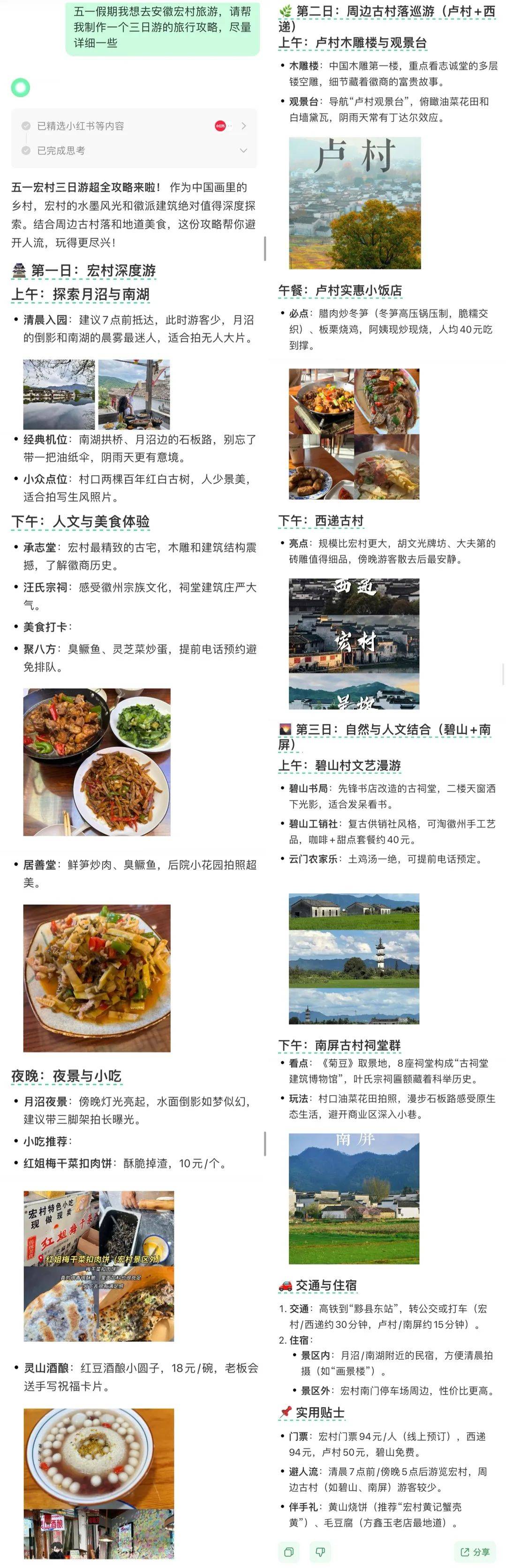 制作一个安徽宏村三日游的旅游攻略,它不仅把行程安排得稳稳当当,几点抵达人少、哪里拍照出片、好吃的菜品有哪些,还把交通、住宿、门票都整得明明白白。