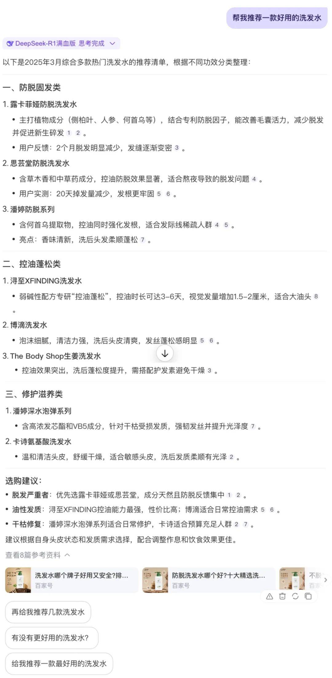 百度则是搜索了百家号等 8 篇参考资料,根据防脱固发、控油蓬松、修护滋养等不同功效,分类整理了 8 款洗发水。