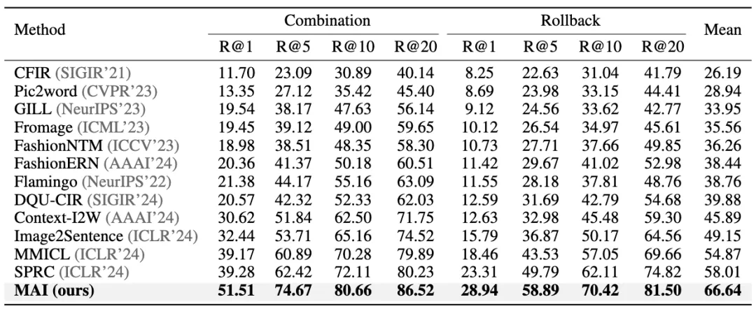 表1的实验结果表明,本文所提出的MAI方法显著优于现有方法,在检索的召回率平均指标上相比新加坡A*STAR研究院的SPRC方法提高了8.63%,相比北京大学发布的多模态混合输入大模型MMICL提高了11.77%。