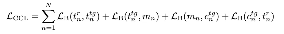 在多轮组合图像检索任务中,修改文本在检索过程中的引导作用至关重要。为此,本文提出了循环组合损失(CCL),旨在通过对多模态信息进行精确对齐,强化图像与文本之间的语义关联,特别是文本修改的语义。具体而言,本文设计的循环组合损失目标是通过多轮迭代中图像和文本的语义对齐,确保检索结果更加准确。该损失函数结合了4种嵌入的约束,包括参考图像的语义嵌入、目标图像的语义嵌入、修改文本的语义嵌入以及目标图像的文本特征。通过多轮训练,强化每轮之间语义的传递和优化,使得最终的目标图像能更好地与修改文本匹配。循环组合损失(CCL) 由以下4项损失组成: