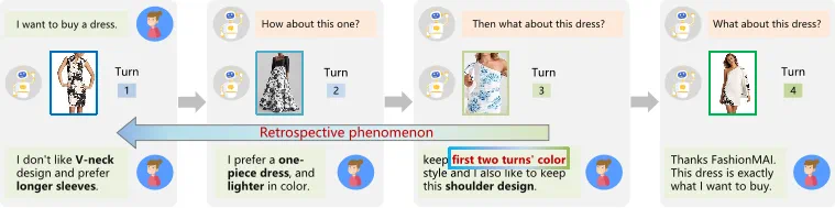 多轮组合图像检索(MTCIR)作为电商场景的关键技术,旨在通过持续对话理解用户动态调整的需求。现有方法采用”多轮串联单轮”范式时,模型陷入仅依赖当前轮次图像的路径依赖,导致历史语义链路断裂——当用户修改需求涉及历史属性时(如”保留前两轮的袖口设计”),检索系统因无法回溯上下文而失效。这一现象暴露两大关键不足:首先,现有数据集构建方式割裂了跨轮次的语义关联,使模型陷入局部最优陷阱;其次,传统单轮优化范式难以适应多轮场景的语义累积特性,在长程信息传递与动态记忆压缩方面存在设计局限。