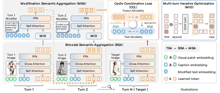 本文进一步提出了多轮聚合-迭代模型MAI,重点应对MTCIR中的两大挑战:(1)多模态语义聚合,(2)多轮信息优化。具体而言,MAI引入了一种新的两阶段语义聚合(TSA)范式,并结合循环组合损失(CCL)计算。TSA通过引入描述文本作为过渡,逐步将图像与其描述文本聚合,再与修改文本聚合。CCL的循环结构进一步增强了语义一致性和模态对齐。此外,本文设计了一种无参数的多轮迭代优化(MIO)机制,动态选择具有高语义多样性的代表性标记,有效压缩了历史数据表征的存储空间。实验结果表明,本方法在所提出的新基准FashionMT的召回指标上平均提升了8%,优于现有方法。