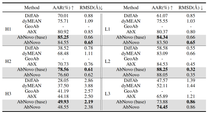 此外,与论文中第一阶段的基础模型相比,AbNovo 在所有指标上都表现出显著的改进,凸显了约束偏好优化的有效性。