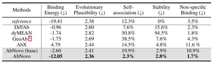 AbNovo 和当前主流的抗体设计模型做了比较,例如 DiffAb、dyMEAN、GeoAb 和 AbX。在所有独立于参考的指标上的表现均优于所有基线方法。