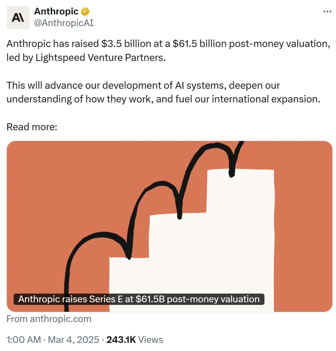 博客地址:https://www.anthropic.com/news/anthropic-raises-series-e-at-usd61-5b-post-money-valuation