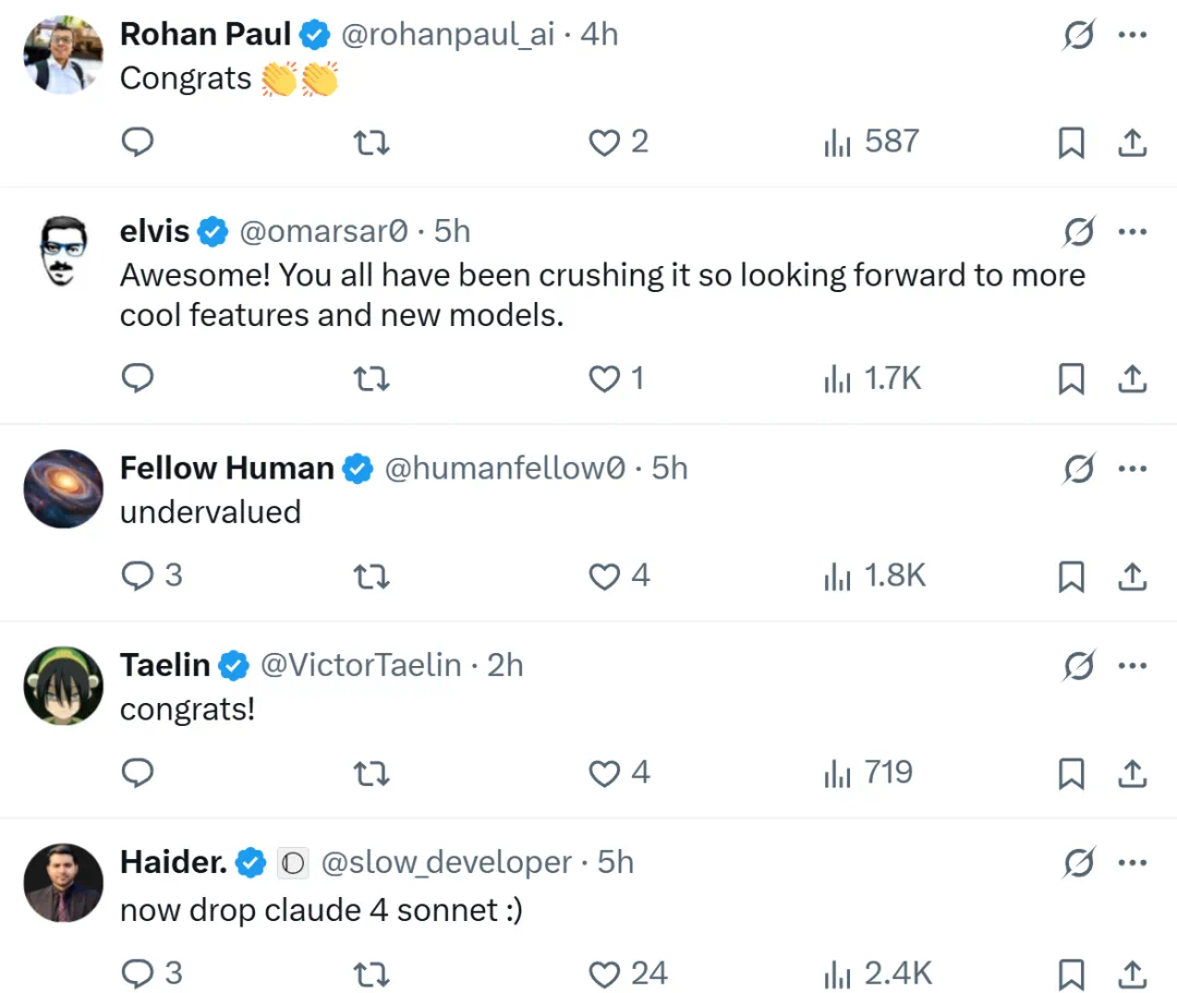 融资消息一出来,评论区热闹了起来。有人表示祝贺,有人认为估值过低,还有人催发 Claude 4 Sonnet。