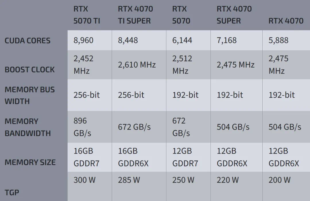 下图罗列了 RTX 5070 的详细规格以及与 5070 Ti、4070 系列的参数比较: