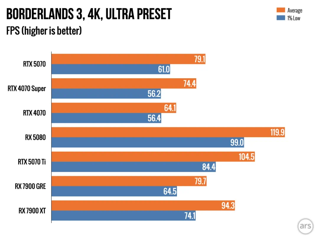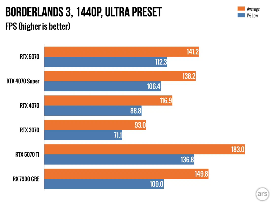 如果和 AMD 的显卡进行横向对比,我们目前还不能将 5070 与 RX 9070 系列直接进行比较。但值得注意的是,在没有光线追踪效果的基准测试(1440p)中,5070 的表现略优于旧款 RX 7900 GRE(光线追踪游戏中的差距更大,因为 AMD 在这些游戏中通常存在性能缺陷)。