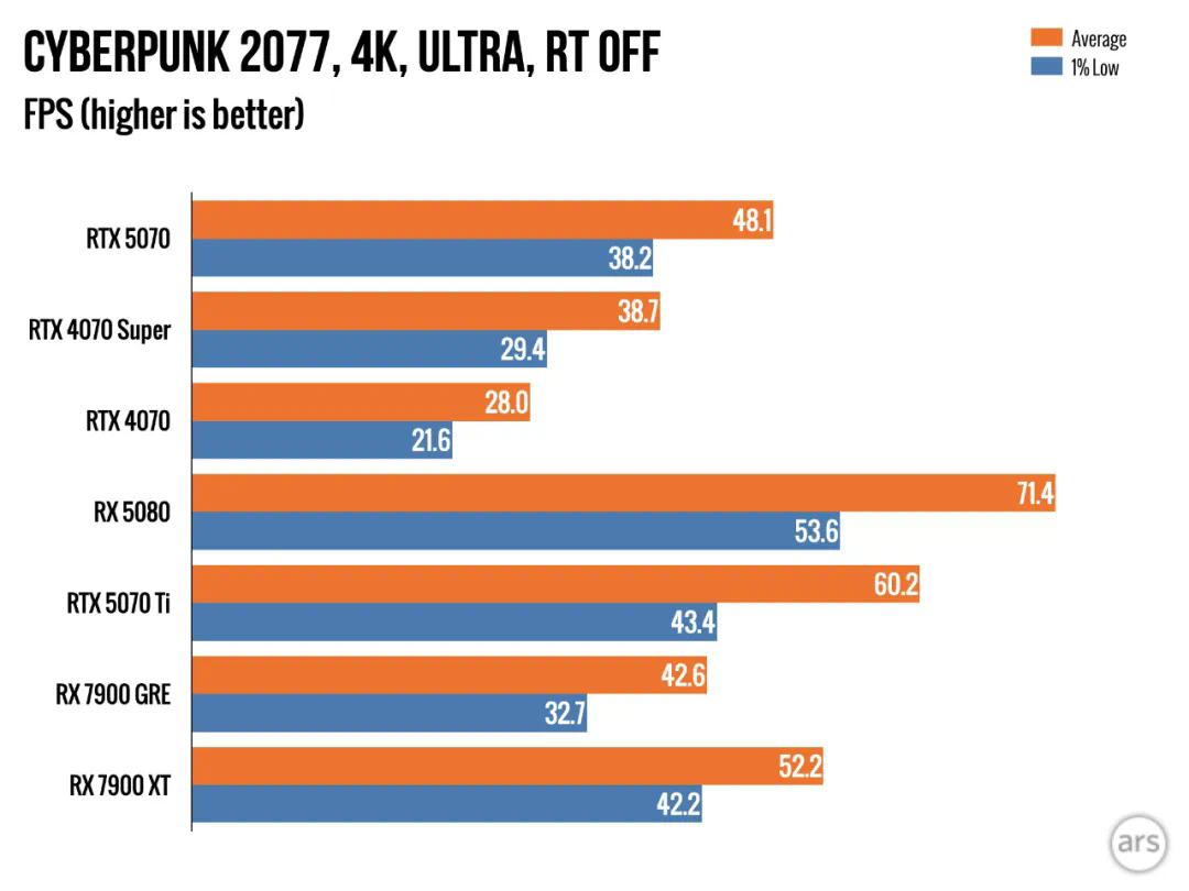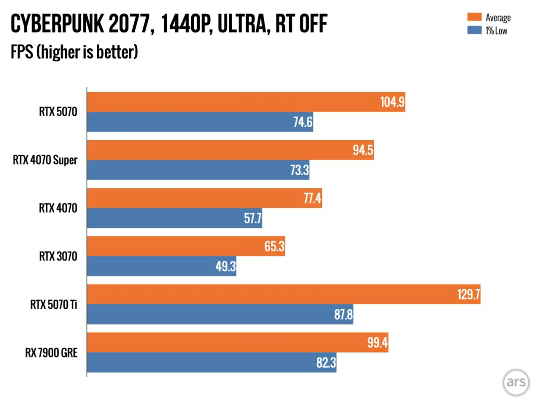 1440p《赛博朋克 2077》游戏中,RTX 5070 略优于 RX 7900 GRE。