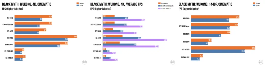 还有国产 3A 大作《黑神话悟空》的评测。这是一个较新的游戏,基于虚幻 5 引擎,支持全光线追踪,英伟达也专门在 GPU 驱动上进行了优化。可见基础性能与 4070 Super 几乎持平,开 DLSS 后会有更大提升。