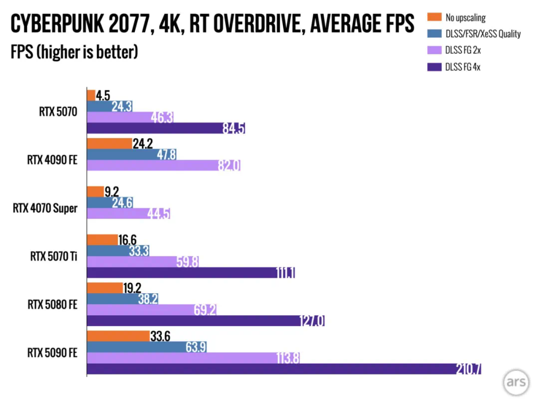 启用 4x 模式的 DLSS 多帧生成(MFG)的 5070 在赛博朋克 2077 中的平均帧速率与启用旧帧生成模式的 RTX 4090 相似(在支持 MFG 的游戏中现在标记为 2x)。这是因为 5070 能够为每个渲染帧生成三个 AI 插值帧(而不是一个)。