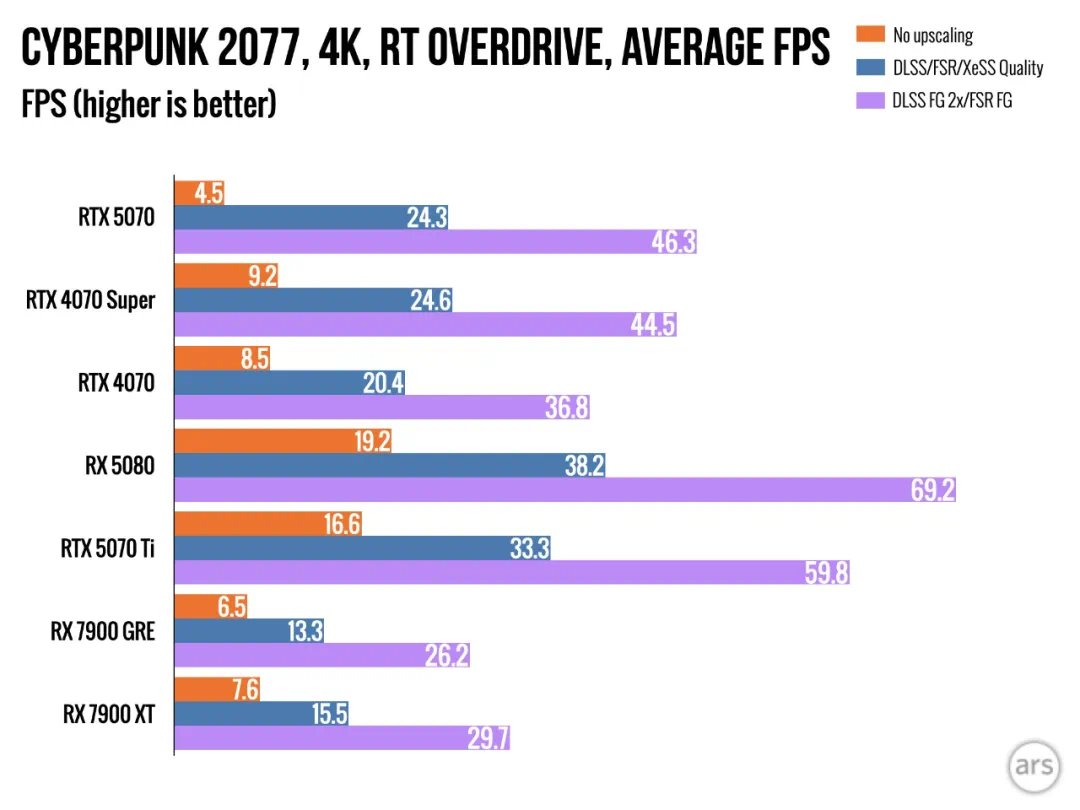所以,RTX 5070(以及未来的 5060 系列)比其他 50 系列卡更能享受新技术的提升。启用 MFG 后,Cyberpunk 2077 在启用 Overdrive 预设的情况下平均每秒可达到 80 帧以上。听起来不错!除非你考虑到基本帧速率(启用 DLSS 升级,但未启用任何帧生成)是接近每秒 20 帧。在如此低的基本帧速率下,用户输入会感觉迟缓,并且当物体运动时,视觉伪影清晰可见。