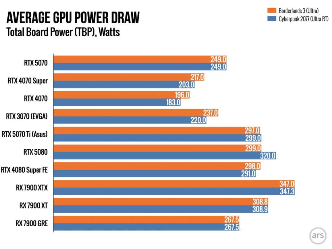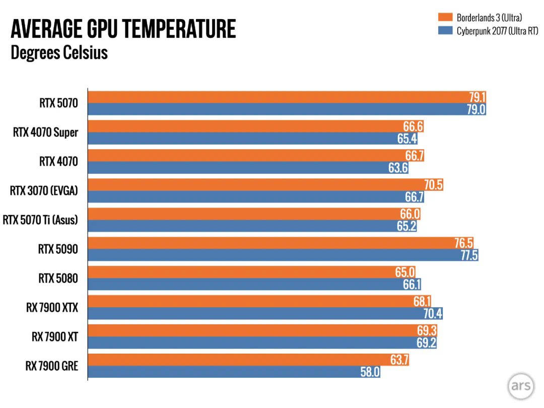 RTX 5070 运行时的温度要比测试的其他显卡更高,可以看到比 5090 还高了几度。图源:arstechnica
