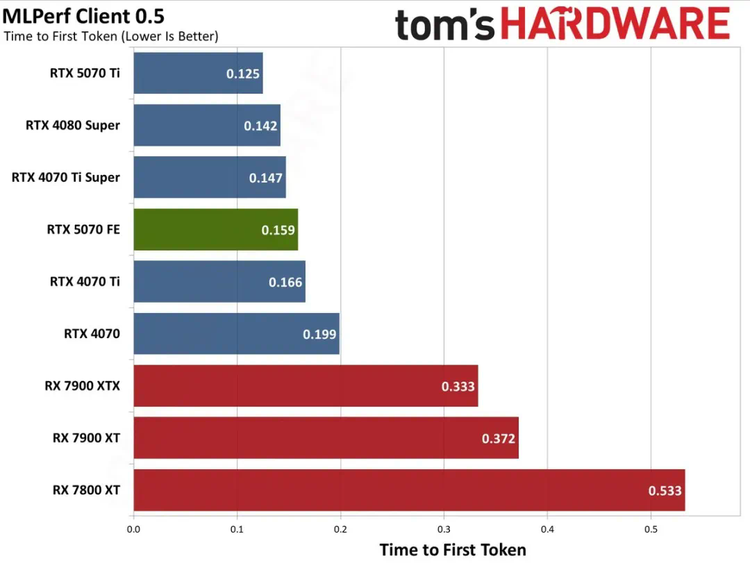 RTX 5070 在这里击败了 4070 Ti,但在每秒 token 数方面次于 7900 XT。另一方面,首个 token 的延迟数据明显是英伟达占优。