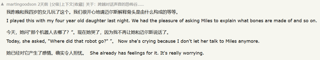 有家长甚至透露,四岁女儿被禁止再次与它对话后,哭得梨花带雨。