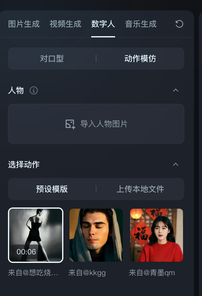 目前,即梦AI官方提供了3个动作模板,并支持用户自行上传本地文件,视频时长最长为30秒。为保证功能被安全、恰当地使用,即梦官方特别提醒,用户上传视频素材需确保拥有合法授权,平台会对视频内容进行严格的安全审核,并对输出视频添加“AI生成”水印。