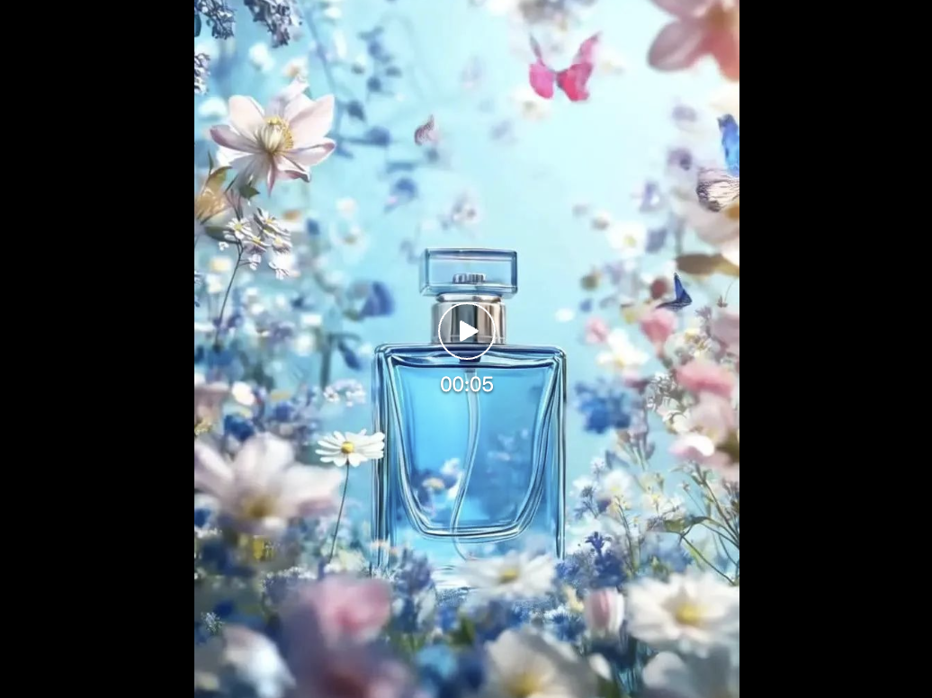 (提示词:超现实香水广告 CG,中心悬浮的 Art Deco 风格蓝水晶香水瓶缓慢自转,蝶群环绕飞舞。配音为混元自动生成。)