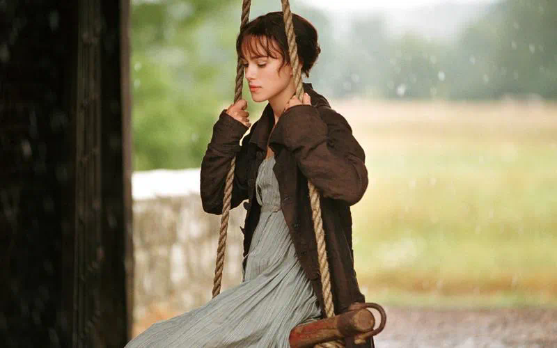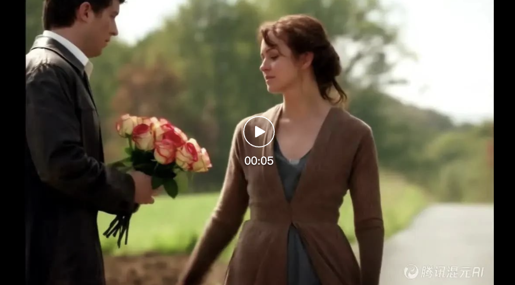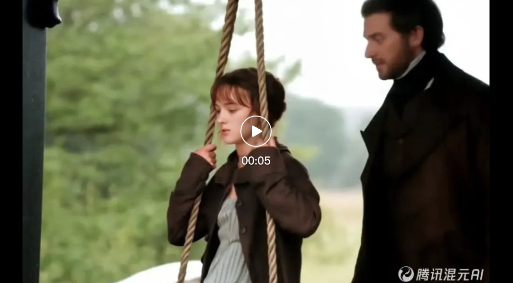 我们还截取了《傲慢与偏见》中凯拉・奈特利的一帧画面,提示词:女生坐在秋千上,画面左侧走过来一个男人。