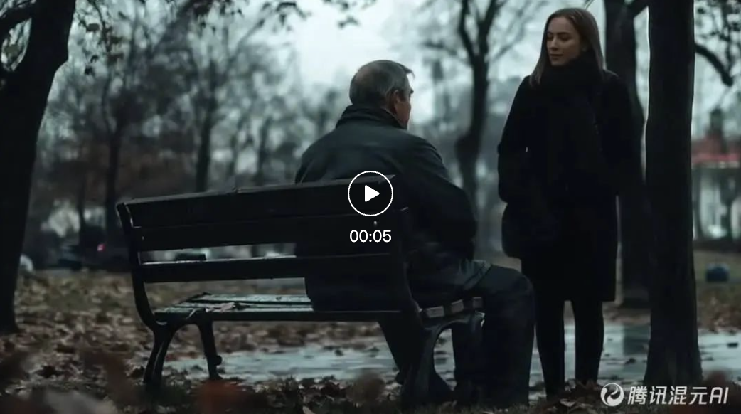 混元严格遵循了文本描述。视频一开始,一位老人独自坐在公园的长椅上,背对着镜头,随着老人目光的移动,画面右侧走进一名身穿黑色风衣的年轻女性。