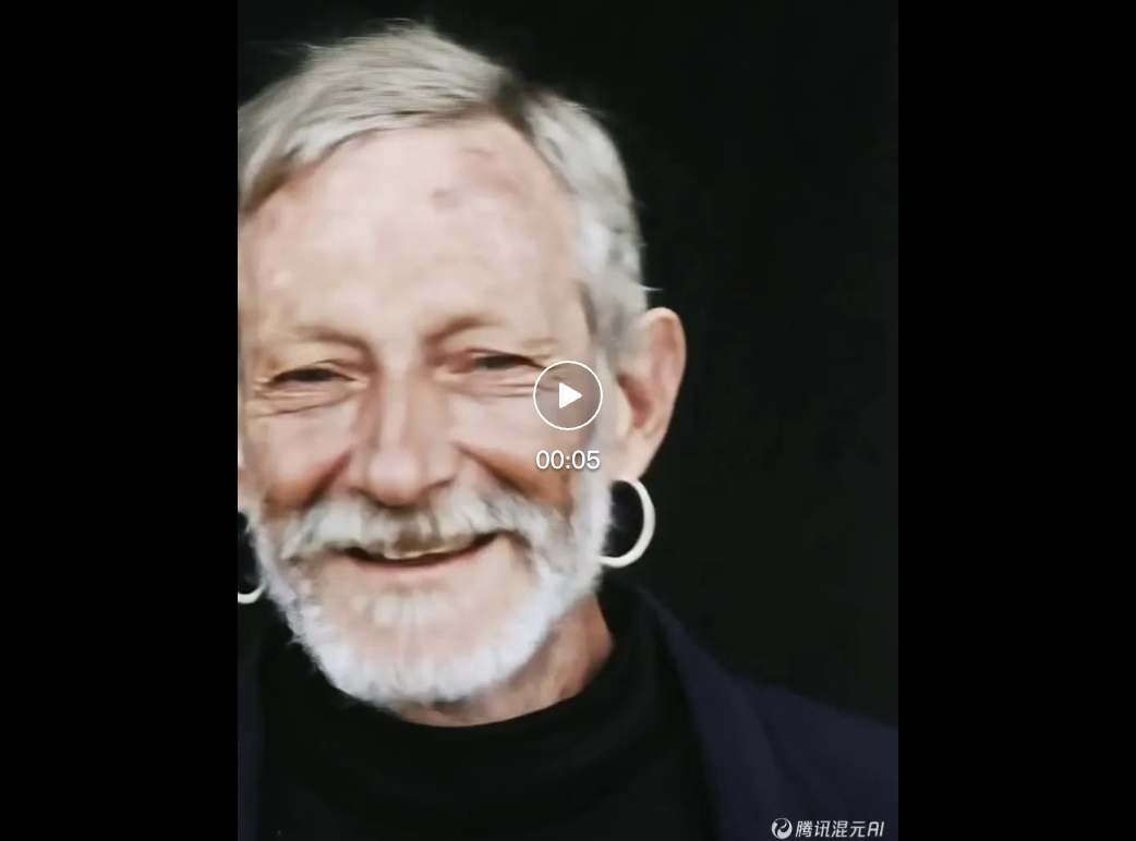 混元生成的视频中,白发老人时而紧盯镜头,时而目光低垂。