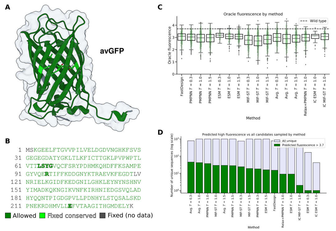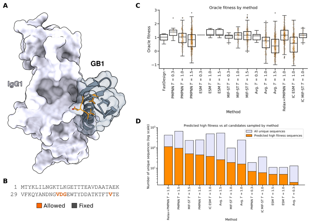 研究目标是找到自监督 ML 方法的最佳实践,以零样本方式设计高适应度蛋白质变体。结果显示,提高采样温度可增加多样性并扩展适应度分布,但未发现单一方法在所有测试用例中表现最优。