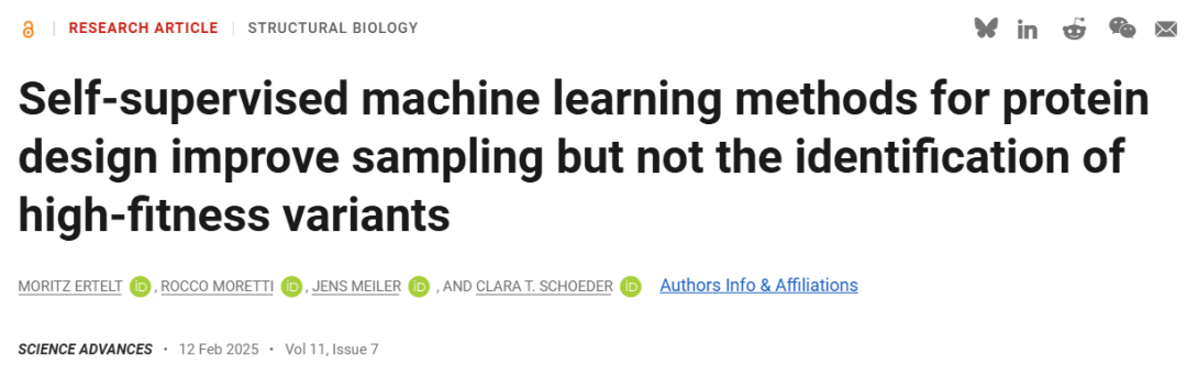 该研究以「Self-supervised machine learning methods for protein design improve sampling but not the identification of high-fitness variants」为题,于 2025 年 2 月 12 日发布在《Science Advances》。