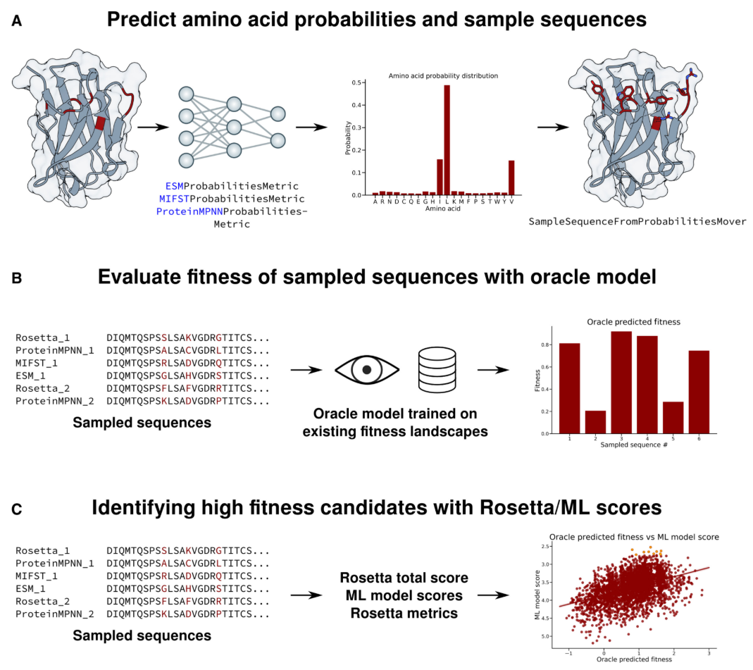 在最新的研究中,德国莱比锡大学(Leipzig University)的跨学科研究团队在 Rosetta 软件框架内建立了一个精简且多样化的工具箱,用于预测氨基酸概率的方法,以便对这些模型进行并排比较。随后,现有的蛋白质适应度景观被用于在现实蛋白质设计环境中对新型 ML 方法进行基准测试。
