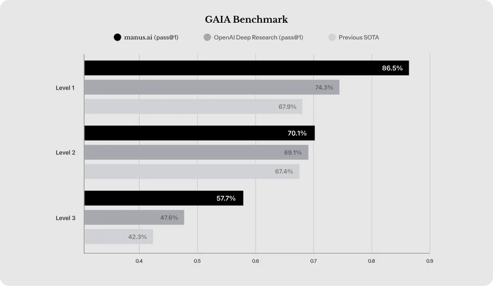 结果显示,Manus 在 Level 1、Level 2 和 Level 3 三个难度级别上均取得了 SOTA 表现,不同程度超越了 OpenAI 此前推出的研究型 AI 智能体 Deep Research。团队表示,Manus 是在使用与其生产版本相同的配置下进行的评估,以确保复现性。