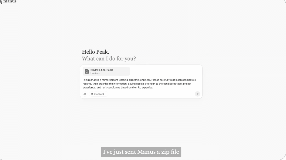 又或者,上传一个包含多份简历的 zip 压缩包,让 Manus 帮忙筛选简历,帮助公司招募一位强化学习算法工程师: